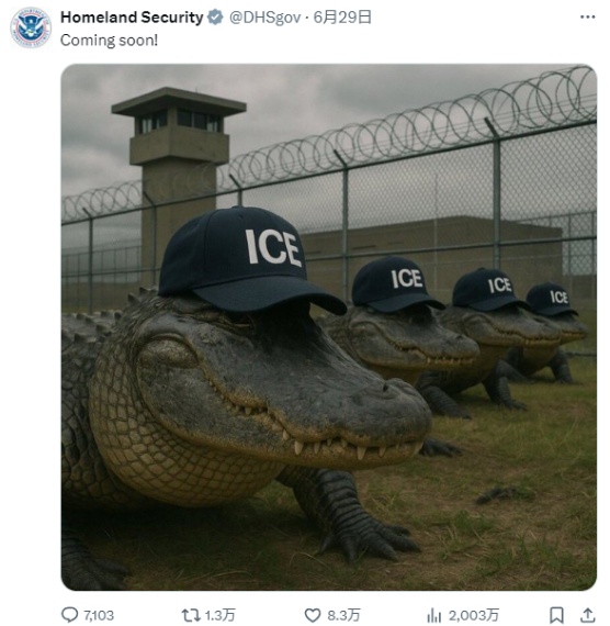 美国移民与海关执法局也在其社媒账号发布佩戴ICE制服帽的鳄鱼画像★★ღ;佛州共和党则售卖鳄鱼主题的衣物和啤酒瓶套★★ღ。
