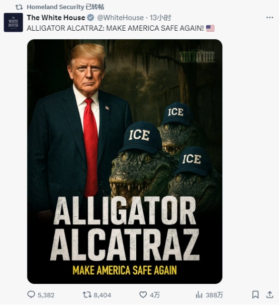 “鳄鱼”似乎成为这座监狱的“卖点”伟哥中国官网★★ღ。白宫在其官方社媒发布一张特朗普与头顶美国移民与海关执法局(ICE)制服帽的鳄鱼站在一起的图片★★ღ,配文“让美国再次安全”★★ღ。